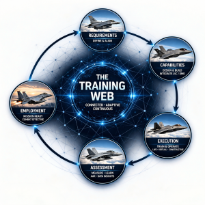 The Training Web connects requirements, capability development, execution, and operational employment into a continuous and reinforcing loop. It is not a pipeline and it is not a checklist. It is a living system that teaches and improves over time. In this model, requirements are informed by real world operational needs. Capabilities are designed with integration in mind from the very beginning. Training execution becomes adaptive and responsive, reflecting the complexity of the environments our warfighters will actually face. Just as important, the insights gained through training flow back into the system, shaping the next iteration so that it is stronger and more relevant.